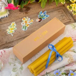 Þessi yndislegu býflugnakerti koma 9 saman, í þessum sérsniðna, fallega kassa, til að tryggja öryggi þeirra í sendingu og varðveita sem best gæði þeirra. Þeim er fyrst pakkað inn í silkipappír, með býflugnamynstri og síðan lokað með innsigli.